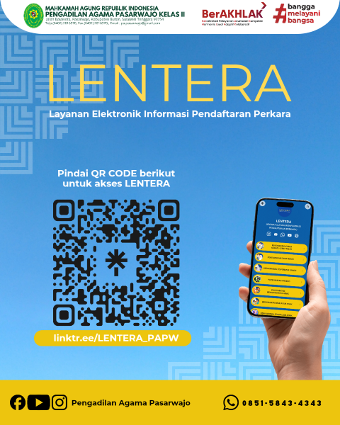 Assalamu Alaikum Wr. Wb. Selamat Datang di Website resmi Pengadilan Agama Pasarwajo. Website ini dibuat sebagai sarana untuk memberikan beragam informasi khususnya yang berkaitan dengan tugas pokok dan fungsi Pengadilan Agama Pasarwajo.